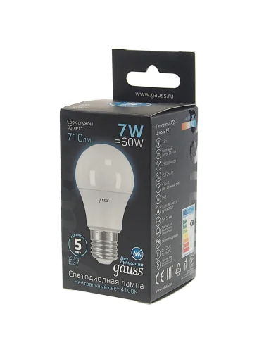 | Наименование | Лампа светодиодная E27 A60 7W (60W) 220V холодный GAUSS GAUSS 102502207 в Уфе Республике Башкортостан |