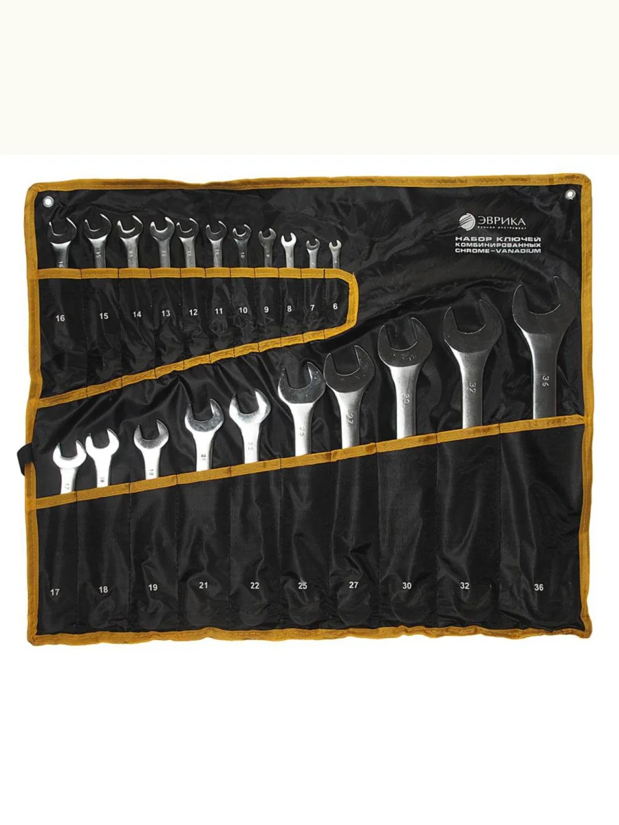 | Наименование | Набор ключей комбинированных 6-36мм 21 предметов в сумке сатинированных ЭВРИКА ЭВРИКА er-10210 в Уфе Республике Башкортостан |