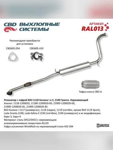 | Наименование | Резонатор ВАЗ-1118 2190 с гофрой нержавеющая cталь CBD в Уфе Республике Башкортостан |