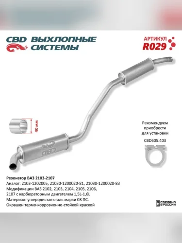 | Наименование | Резонатор ВАЗ-2103 2104 2105 2106 2107 (закатной) CBD в Уфе Республике Башкортостан |