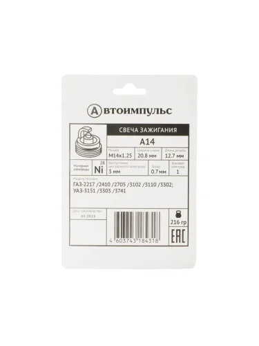 | Наименование | Свеча зажигания А14В ГАЗ-24 АИ-76 (блистер) комплект АВТОИМПУЛЬС в Уфе Республике Башкортостан |