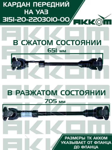 | Наименование | Вал карданный УАЗ-315195 Хантер КПП 5-ти ст. передний (L=651мм) АККОМ АККОМ 31512-2203010 в Уфе Республике Башкортостан |